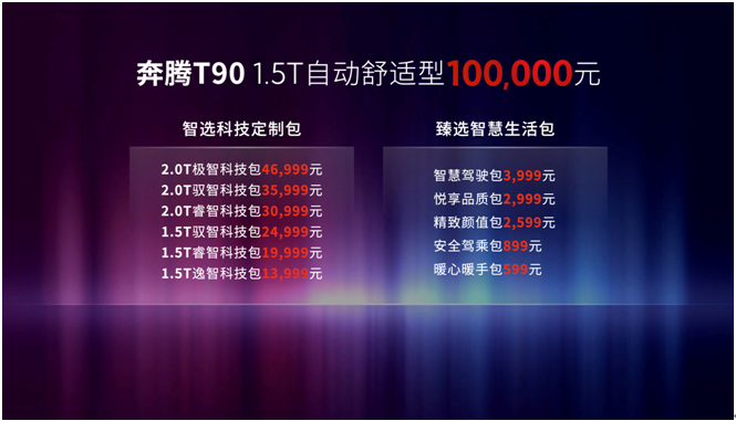 奔騰T90采用了全新的定價模式,打破了車企傳統(tǒng)的款型定價模式。除了有起售價之外,用戶還可以選擇不同的配置升級包,根據(jù)自己的個人需求和預算進行選擇和增配,實現(xiàn)個性化定制。此舉使得消費者可以根據(jù)自己的實際需求定制奔騰T90,為他們提供更具性價比的選擇。