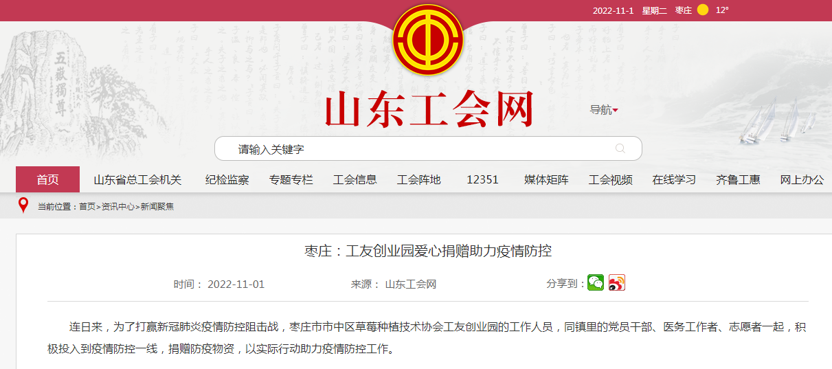 10月29日,棗莊市市中區(qū)草莓種植技術(shù)協(xié)會(huì)工友創(chuàng)業(yè)園號(hào)召會(huì)員單位,為當(dāng)?shù)貞?zhàn)“疫”貢獻(xiàn)力量。滿滿兩車的方便面、面包、八寶粥等愛(ài)心物資,向奮戰(zhàn)在疫情防控一線的工作人員表達(dá)了關(guān)心和問(wèn)候。