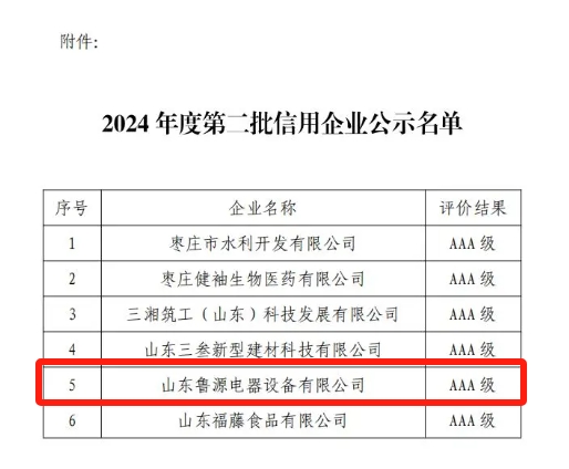 8月6日,《棗莊之窗》從棗莊市企業(yè)聯(lián)合會發(fā)布“關(guān)于公布2024年度第二批信用企業(yè)名單的通知”獲悉,山東魯源電器設備有限公司等6家企業(yè)獲得AAA級信用等級評價,并予以公布。